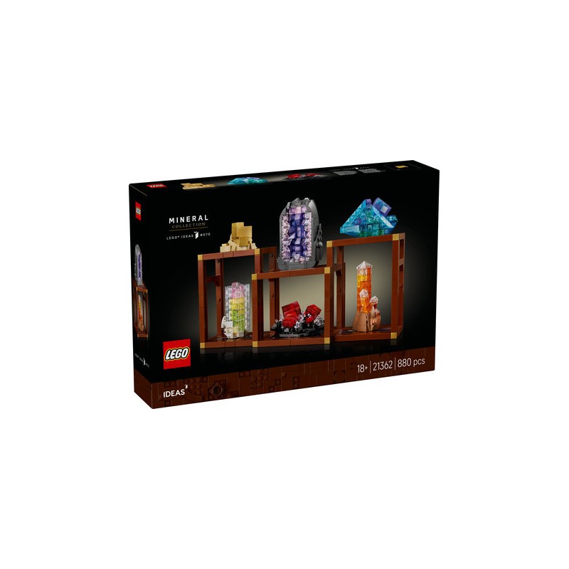 Mettez en valeur les couleurs des minéraux avec le set de construction Collection de minéraux LEGO Ideas (21362) pour adulte. Fabuleux cadeau pour les collectionneurs de cristaux et les amoureux de la nature, ce kit inclut des maquettes en briques de 6 minéraux, ainsi que des étagères à construire pour les exposer et créer une somptueuse décoration pour votre salon. Utilisez des techniques de construction ingénieuses et des briques LEGO transparentes pour recréer une pyrite dorée, une améthyste mauve, une fluorite bleue, une tourmaline pastèque, une rhodochrosite rose saumon et un quartz mandarine. Assemblez les 3 étagères et fixez vos créations sur les plateaux. Disposez les minéraux à votre guise et déplacez-les d’une étagère à l’autre pour renouveler l’exposition. Retrouvez les instructions de montage de ce kit pour adulte dans la boîte ou appréciez une expérience de construction numérique 3D intuitive avec l’application LEGO Builder.
