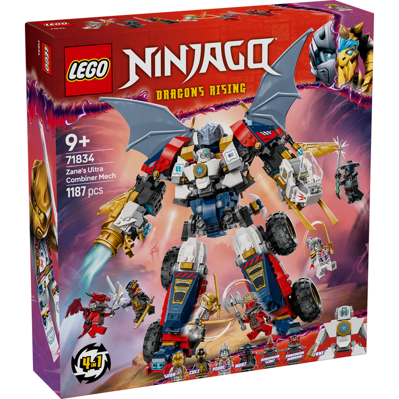 Les garçons et les filles de 9 ans et plus peuvent recréer l’action de la saison 3 de la série TV NINJAGO Le soulèvement des dragons avec le jeu de construction 4-en-1 Le robot ultra combo de Zane (71834). Les enfants peuvent jouer avec le grand robot ultra combo doté d’une tête, de jambes, de pieds, de bras, de poignets et de doigts articulés, ainsi que d’un cockpit et de 2 canons. Ils peuvent ensuite le diviser en 4 maquettes plus petites : un dragon avec des ailes et des membres articulés, un avion avec des moteurs mobiles et un cockpit rotatif, une voiture avec des grandes roues tout-terrain et 2 cockpits ouvrants, dont un avec des blasters cachés et une figurine de Zane. Avec les 6 minifigurines de ce jeu de construction, les enfants peuvent mettre en scène des combats passionnants pendant des heures. Les Ninjas Sora et Cole, ainsi que leur alliée Pixal, sont équipés d’incroyables armes pour affronter le trio de méchants constitué de Nokt, d’un Guerrier draconique et d’un Éclaireur draconique munis de leurs propres armes. Dimensions – Le robot de ce set de construction LEGO de 1 187 pièces pour enfants mesure plus de 35 cm de haut avec les ailes levées.