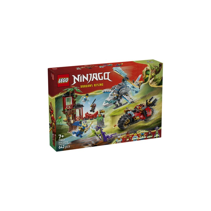 Fans will have all they need to play out battle action with this LEGO NINJAGO Ninja Vehicle Tree House Battle (71857) building toy for 7+ year old boys and girls, based on season 4 of the Dragons Rising TV show. This building set comes with a 3-storey toy tree house, a helicopter, a ninja motorbike and 6 LEGO NINJAGO minifigures. The tree house includes a workshop, a tearoom, a terrace, a swinging vine rope, a trap that releases a small rock, a rotating bridge and a stud shooter. Kids can enjoy unlimited role-play options with a motorbike toy that has moving wheels, a saddle-cockpit and 2 stud shooters, or take to the sky with a helicopter toy that has an opening cockpit and rotating blades. The NINJAGO set also features 6 minifigures: Kai, Zane, Dragon Form Jay and Euphrasia to play out battles against the Acid Monster and Loyalist. Kids can build the playset with confidence using the LEGO Builder app – zoom, rotate in 3D and track progress with easy-to-follow digital instructions. The LEGO NINJAGO range of building sets and ninja toys includes detailed mechs, vehicles, dragons and temples so fans can role-play awesome ninja action. This action-packed set makes a great birthday gift idea for 7+ year old boys, girls and Dragons Rising fans.